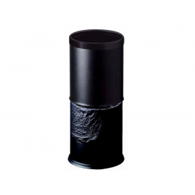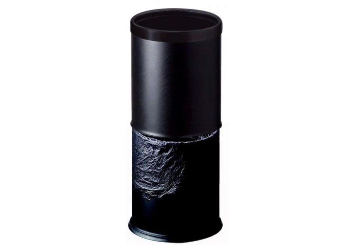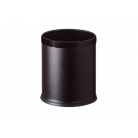 Dvouplášťový pokojový odpadkový koš s vnějším pláštěm z černé koženky a s vnitřním pláštěm z černě lakované oceli. Koš také obsahuje "neviditelný" vnitřní plastový sáček, černý horní rámeček a protinárazovou základnu.