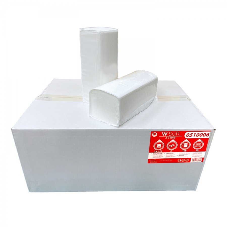 Papírové ručníky ZZ skládané 2vr., 100% celulóza. Barva bílá. Rozměr 24x21 cm. Karton obsahuje 20 balíčků po 150ks. Cena za balení. Váha 1 karton = 6 kg.